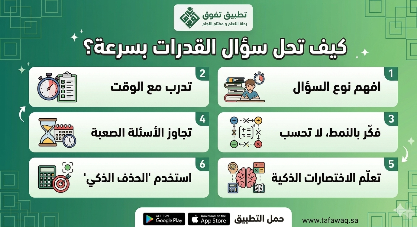 اختبار القدرات مو بس اختبار معرفة، هو اختبار سرعة تفكير + دقة + إدارة وقت. كثير طلاب مستواهم كويس، لكن يخسرون درجات بسبب البطء أو التردد. لذلك السر الحقيقي مو إنك تعرف الحل فقط، بل إنك توصل له بسرعة وبدون تعقيد. في هذا المقال، بنشرح لك كيف تسرّع حل أسئلة القدرات بطريقة عملية وواضحة تقدر تطبقها مباشرة….