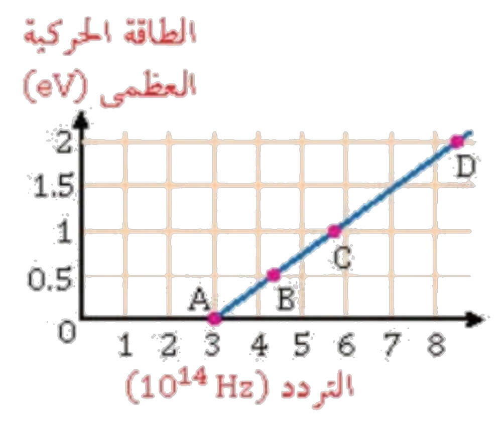 يمثل الرسم البياني المجاور العلاقة بين الطاقة الحركية العظمى والتردد لفلز ما، يمثل تردد العتبة عند النقطة