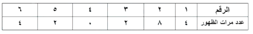 الجدول التالي يبين الرقم الظاهر على الوجه العلوي لحجر نرد عند رميه ٢٠ مرة، ما الاحتمال التجريبي لظهور الرقم ٣؟