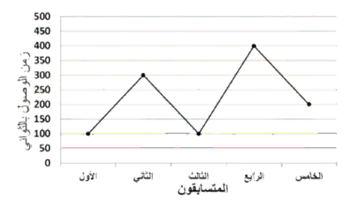 الشكل التالي يبين نتائج خمسة متسابقين في سباق الخيل، كم الفرق بالدقائق بين المتسابقين الرابع والأول؟ ![]()