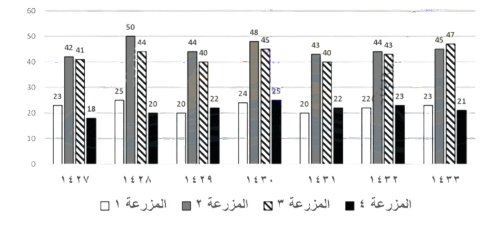 الشكل التالي يمثل إنتاج مصنع لقوارير مياه من البلاستيك في أربع شهور، فإذا كان ١٠ % من القوارير تالف وسعر القارورة ٢ ريال، ما عدد القوارير المنتجة بالمئات نهاية الشهر الثالث؟ ![]()
